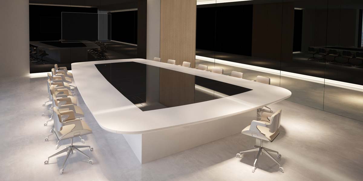 Basado en Muro/Galería estructural de diferentes dimensiones y acabados configura la pieza diferencial de la colección. Desde una simple solución de mesa individual a configuraciones provistas de acceso a galería interior para facilitar el mantenimiento del equipamiento técnico en este tipo de mesas con grandes dimensiones y libertad formal.