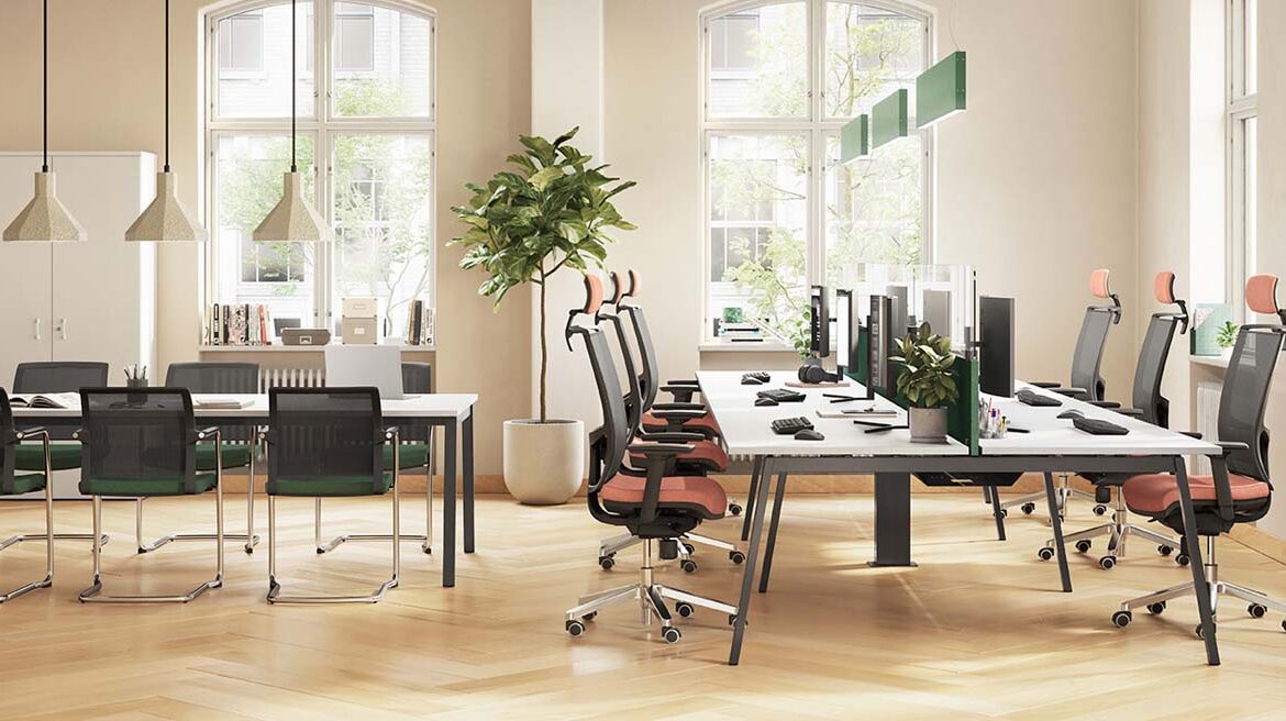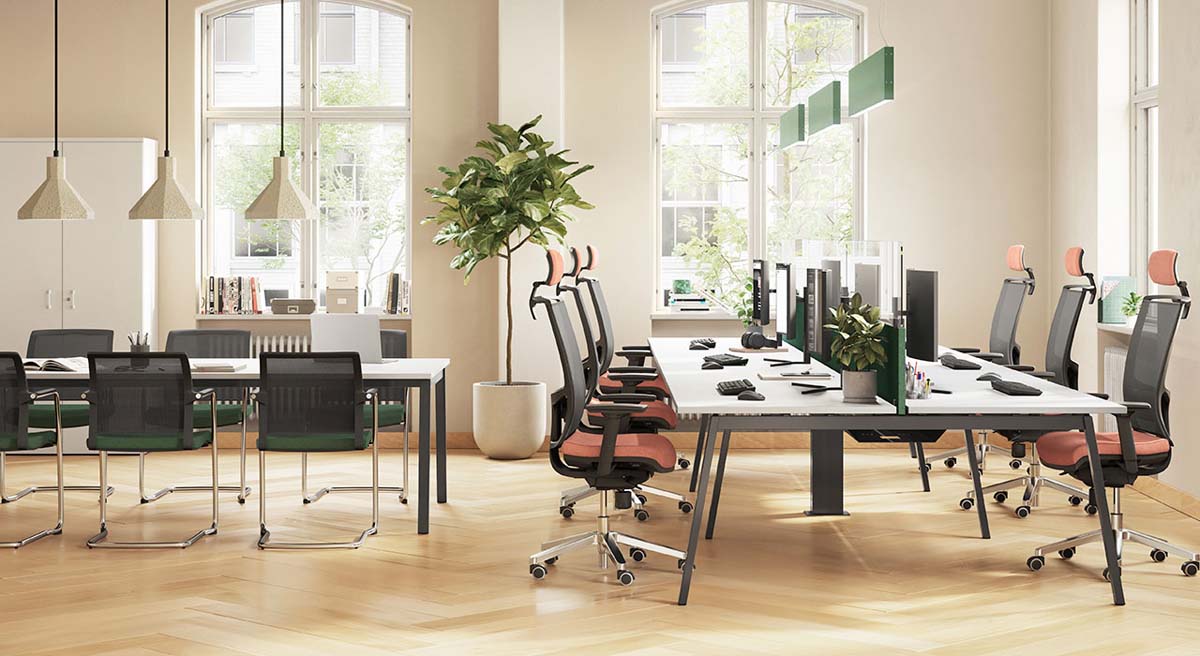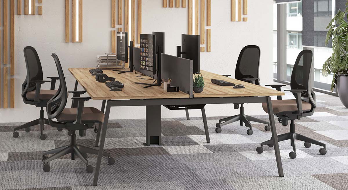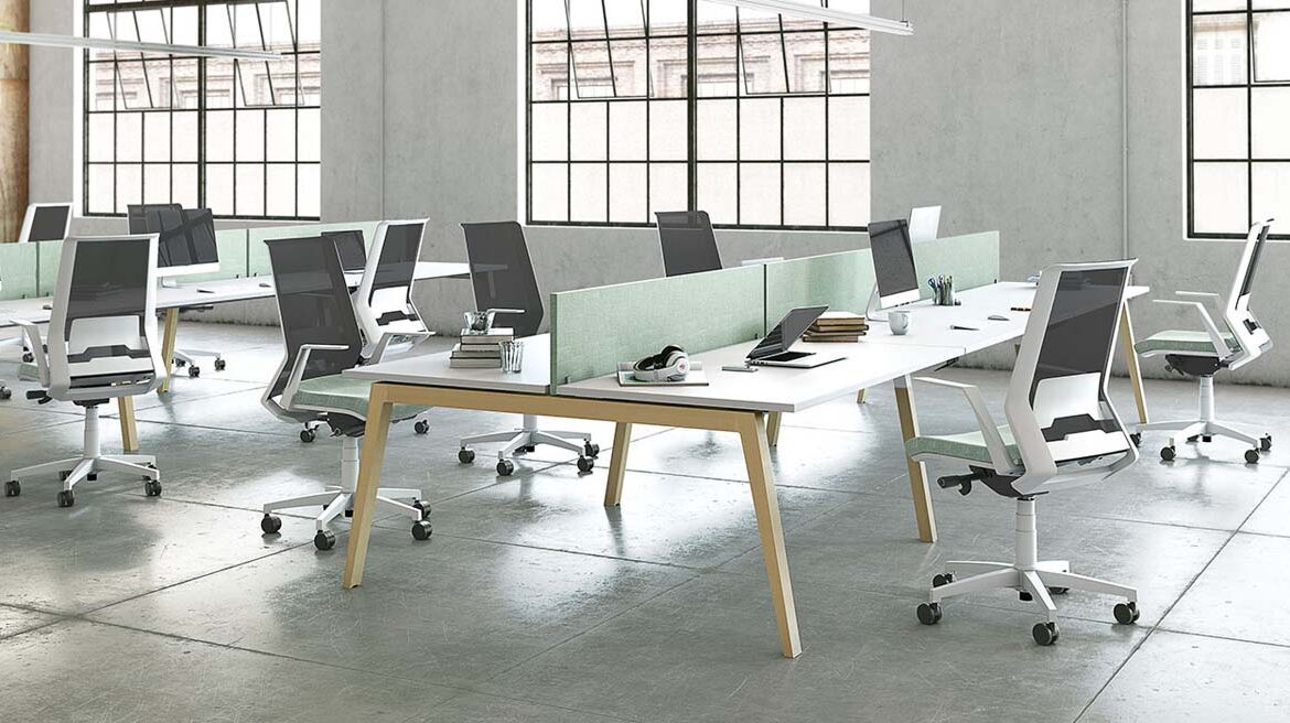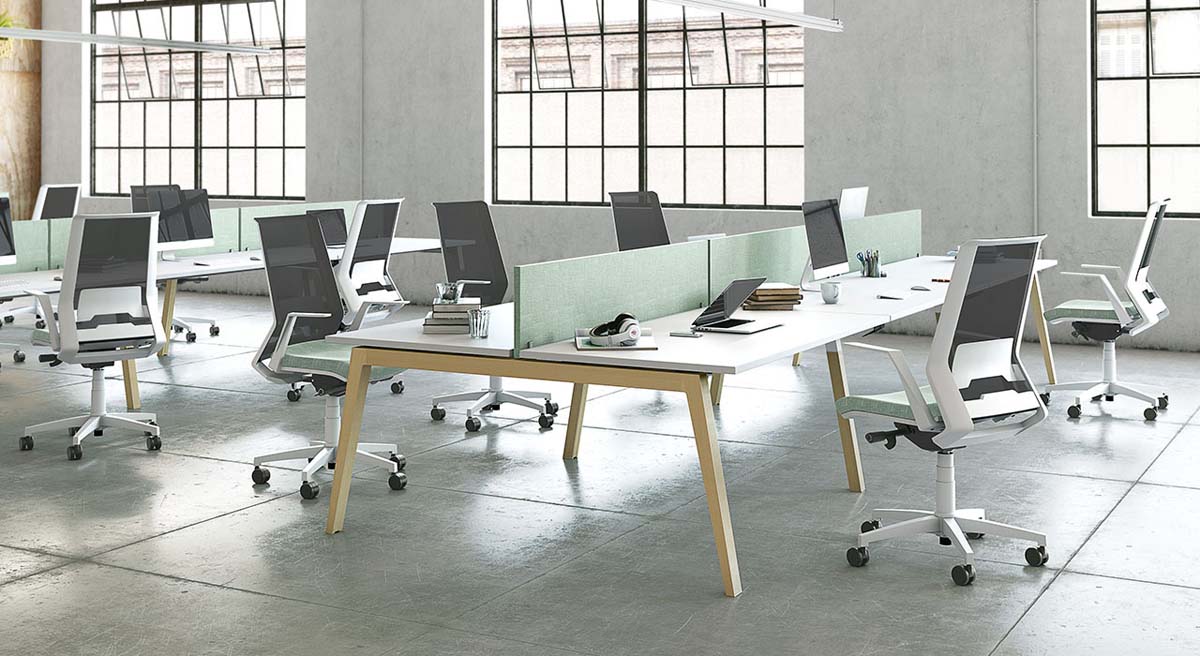 Una serie de mesas de oficina con un diseño que se adecua a cualquier tipo de ambiente o de otro mobiliario de oficina existente.