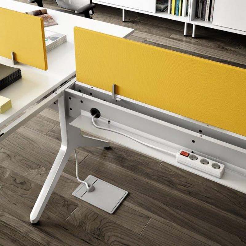 La estructura consta de 2 patas metálicas con forma de Y invertida fabricada mediante dos chapas de corte láser de 2mm. unidas entre sí mediante una pletina enervada de 4mm. de espesor. Cada pata va terminada con un embellecedor plástico montado a presión fabricado en polipropileno de varios colores. Acabado de las patas en pintura epoxi color aluminio, blanco ó negro. Las patas incorporan un nivelador fabricado en termoplástico antideslizante color negro con regulación de 25 mm. en altura.