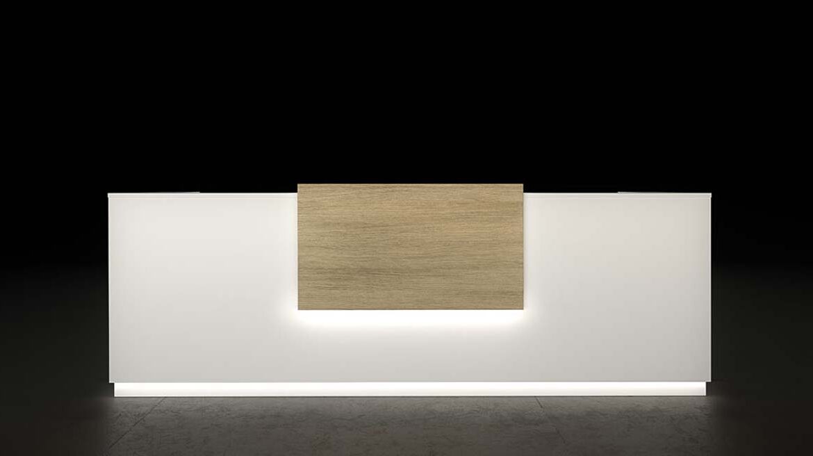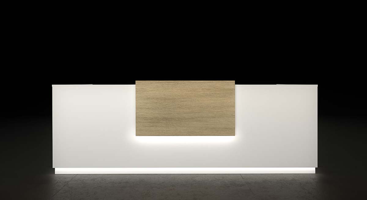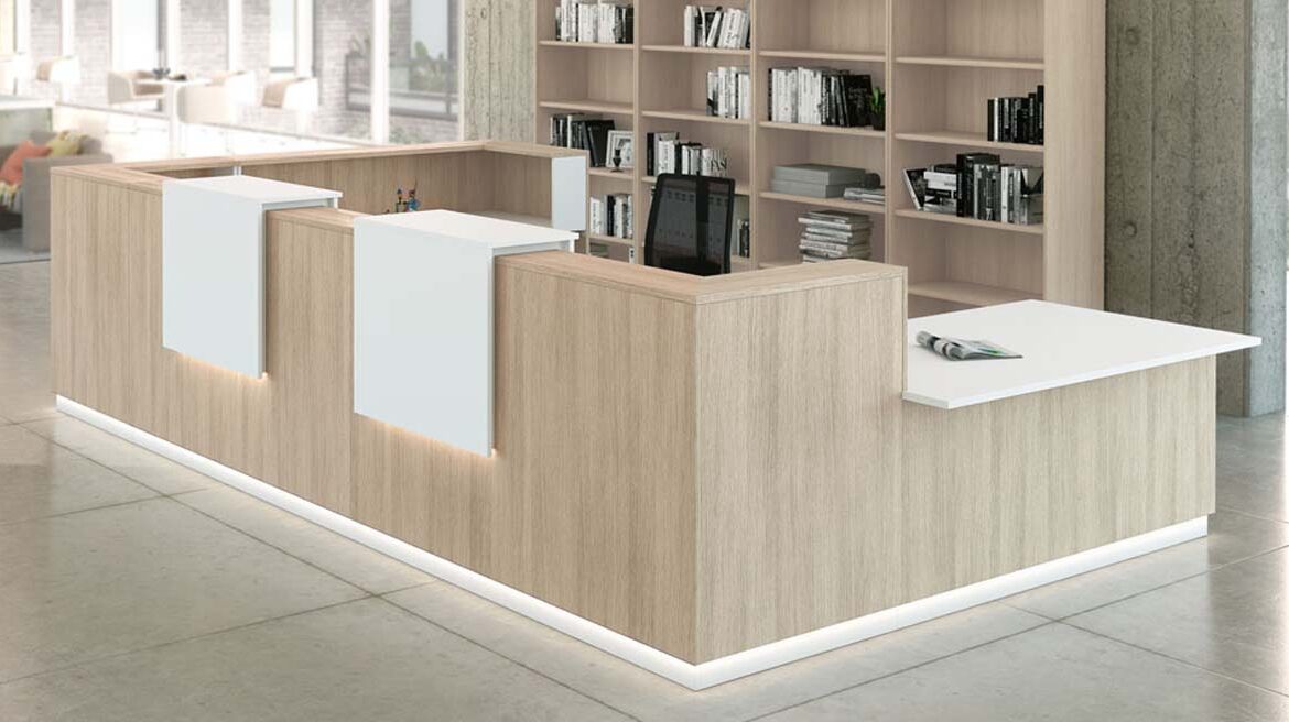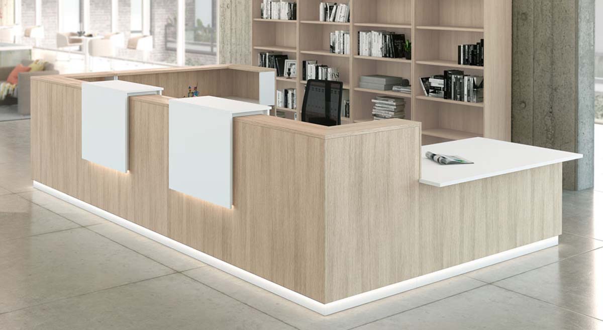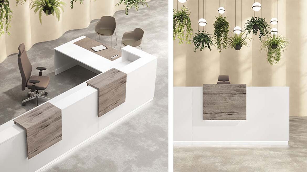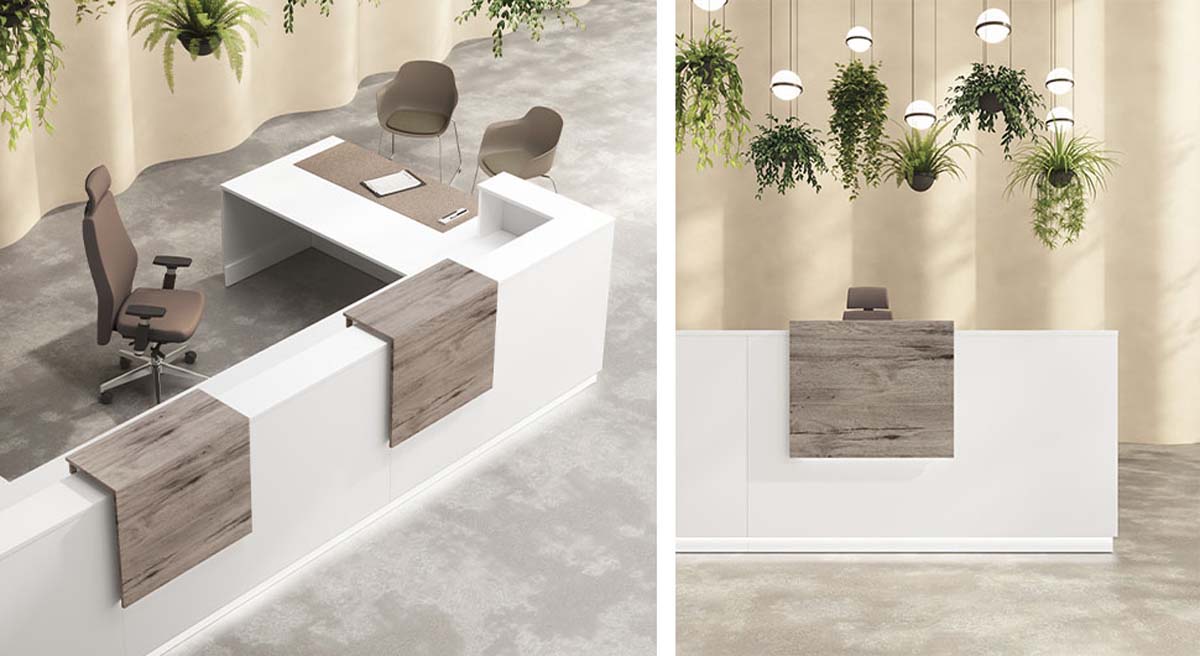 El mostrador recepción, al minimalismo y versatilidad le añadimos detalles elegantes como el zócalo y los encuentros a inglete de la parte superior del mostrador. Elementos que hacen de este mostrador recepción uno de los mejores de su gama en relación calidad-precio. Dispone de crecimiento horizontal, pudiendo hacer composiciones en esquina y módulos bajos de atención al público. Sin duda una de las recepciones más solicitadas hoy en día en las oficinas.