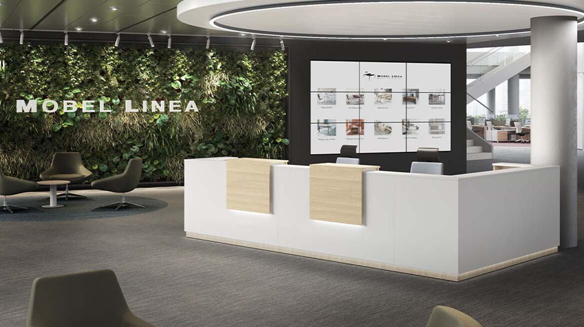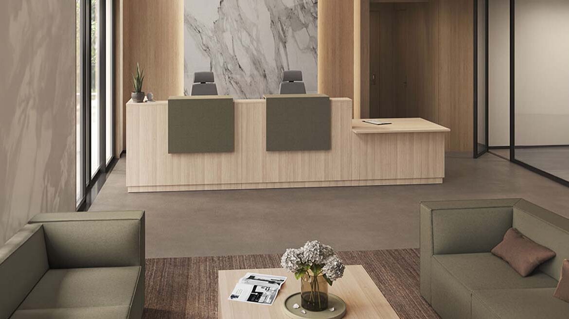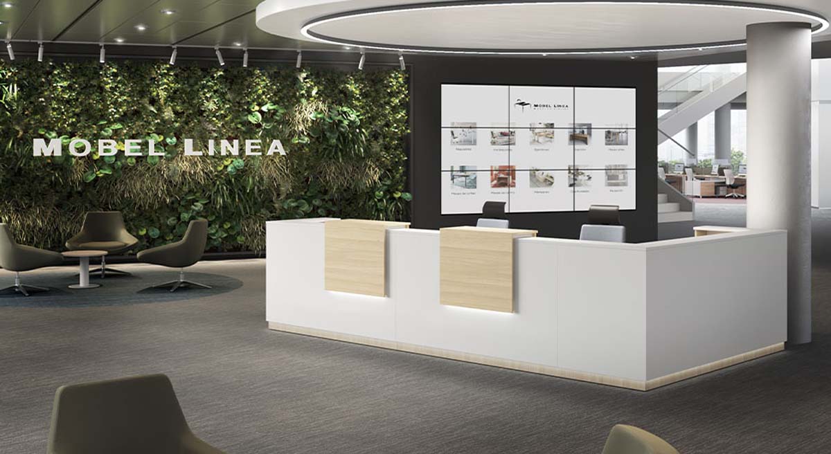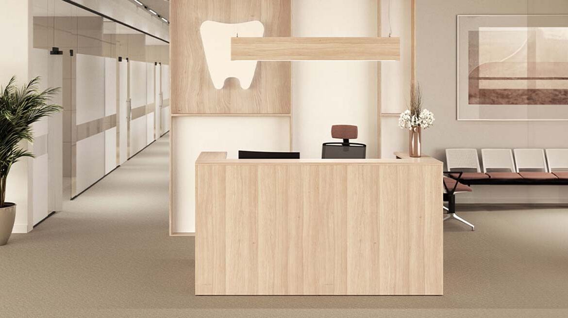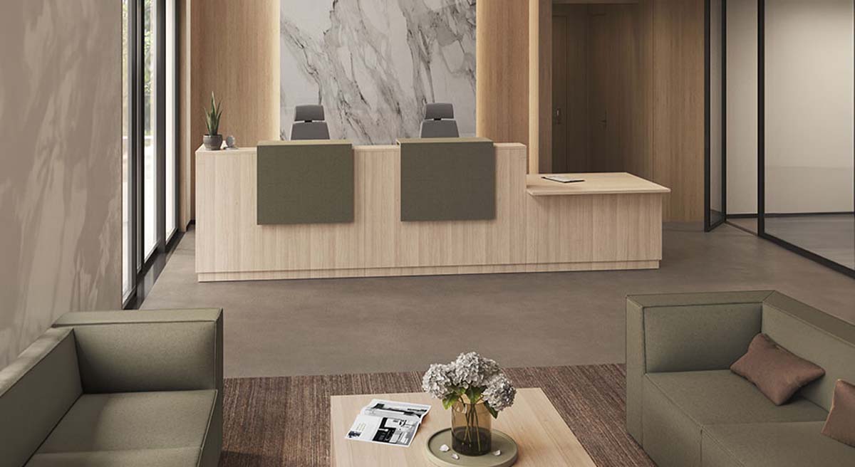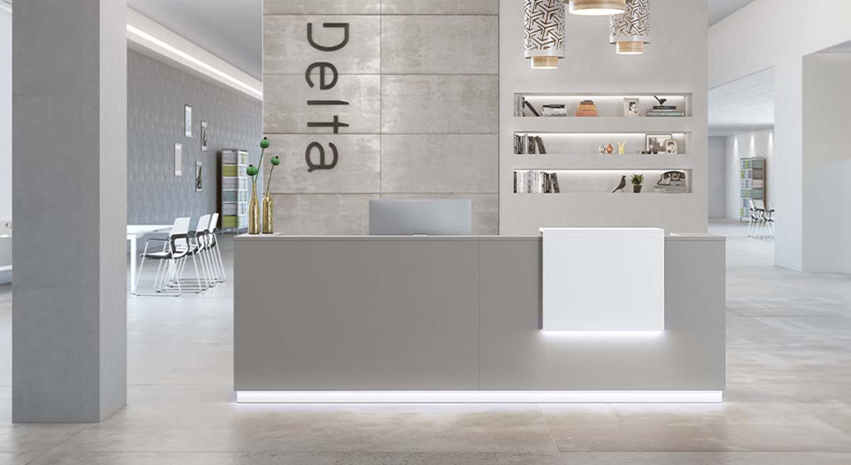 El mostrador recepción, al minimalismo y versatilidad le añadimos detalles elegantes como el zócalo y los encuentros a inglete de la parte superior del mostrador. Elementos que hacen de este mostrador recepción uno de los mejores de su gama en relación calidad-precio. Dispone de crecimiento horizontal, pudiendo hacer composiciones en esquina y módulos bajos de atención al público. Sin duda una de las recepciones más solicitadas hoy en día en las oficinas.