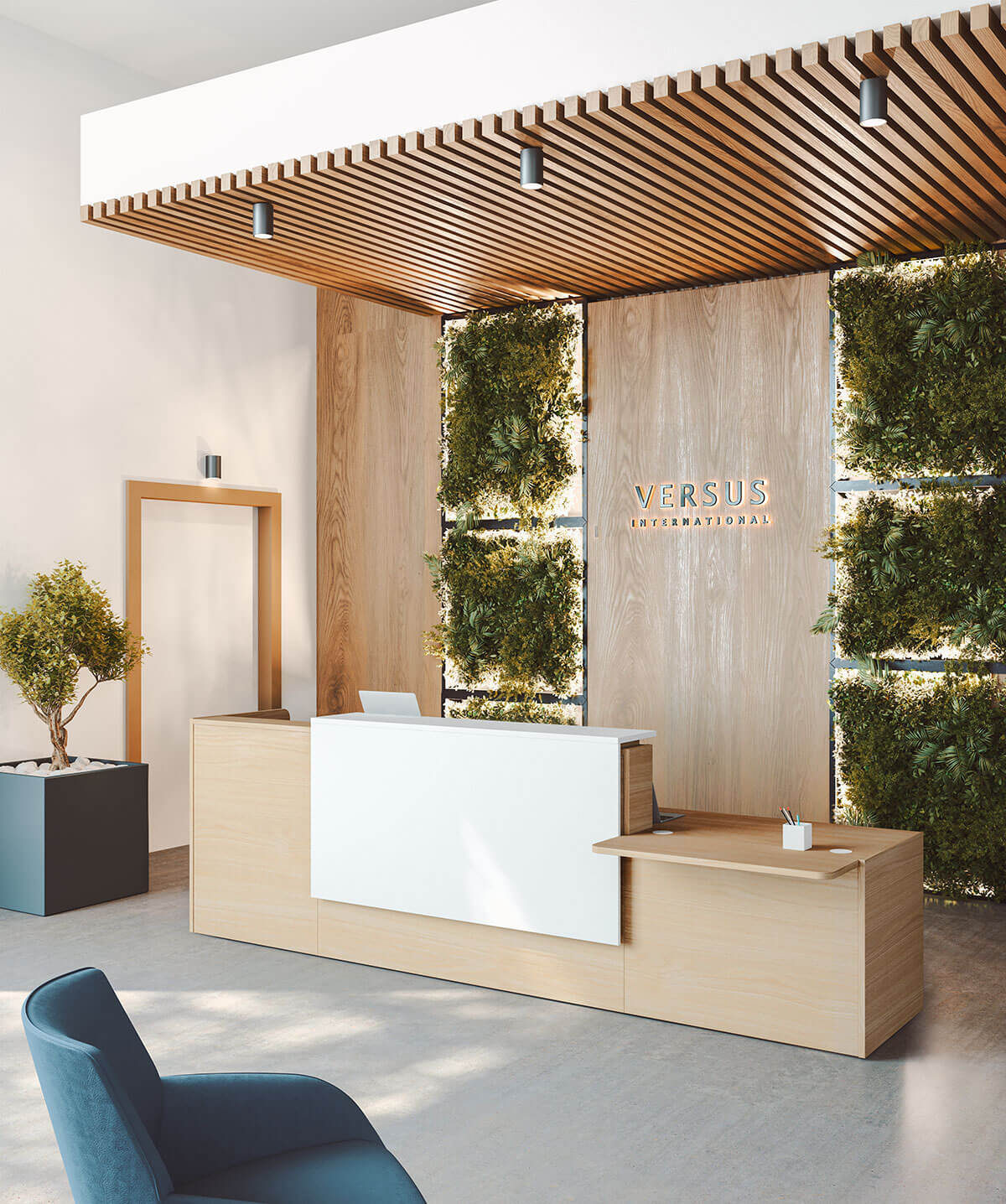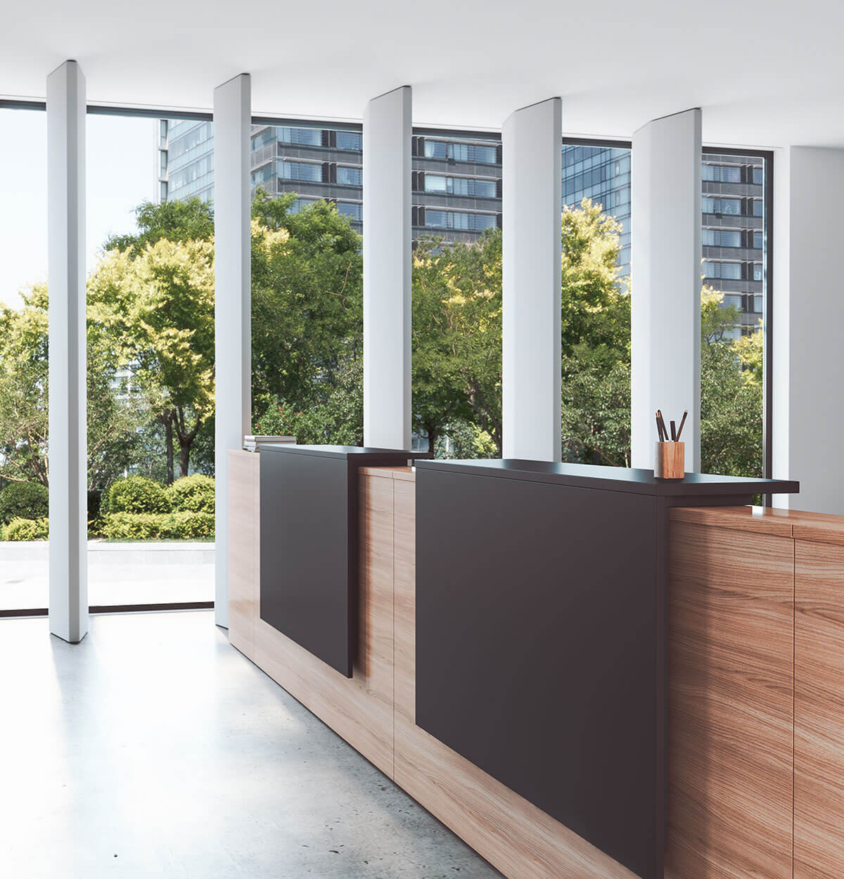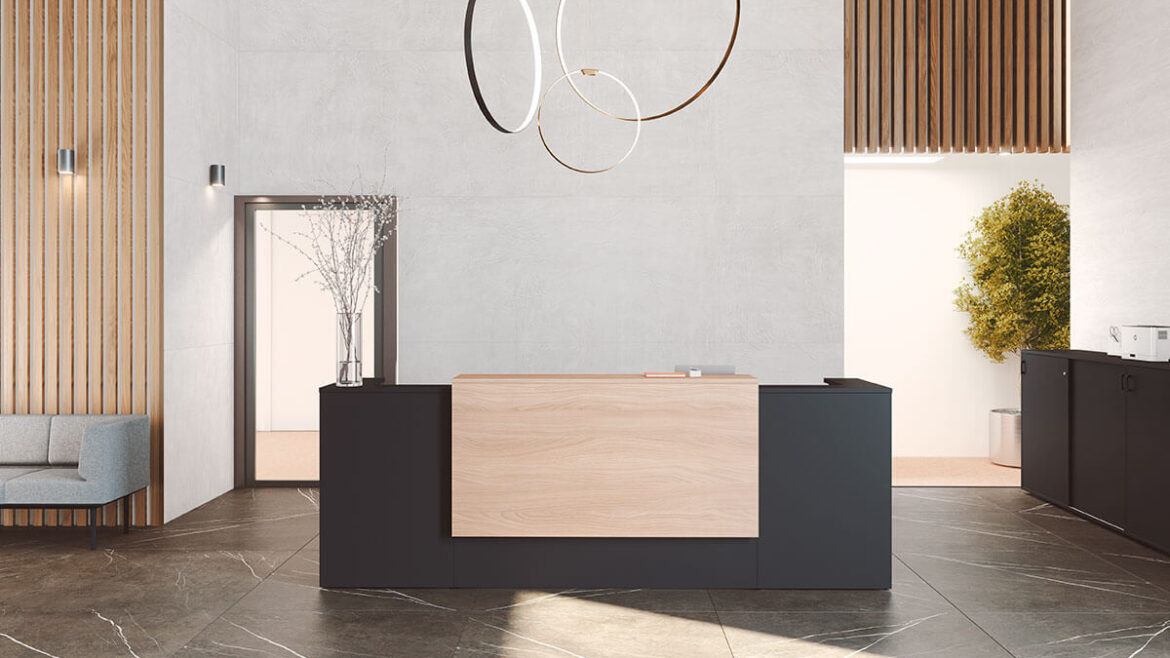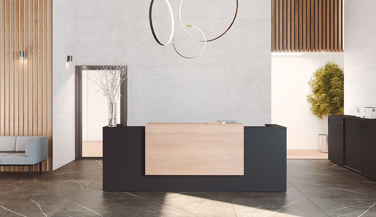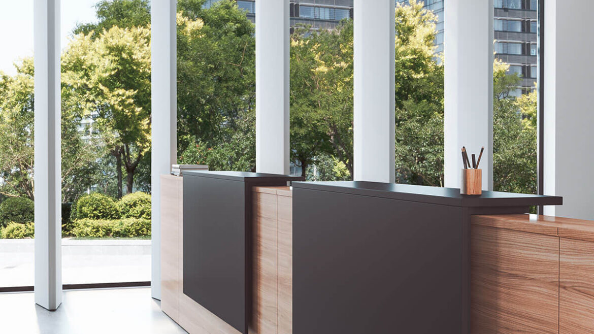 El mostrador Ofimat Plus de Actiu es ideal para recepciones y se ajusta a cualquier entorno, ya sea oficinas, gimnasios, centros educativos o museos. Este mostrador de oficina ofrece una amplia gama de dimensiones debido a su programa configurable, así como una extensa variedad de acabados y complementos.