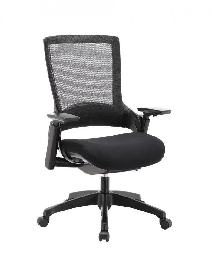 El sillón serie MIL dispone de reposabrazos regulables 3D, mecanismo Synchrom con bloqueo operativo multi-posicional (5 posiciones), regulación de la altura y profundidad del asiento, soporte lumbar ajustable en altura, estructura y base de nylon color negro con ruedas, respaldo en malla negra y asiento tapizado en tela negra.